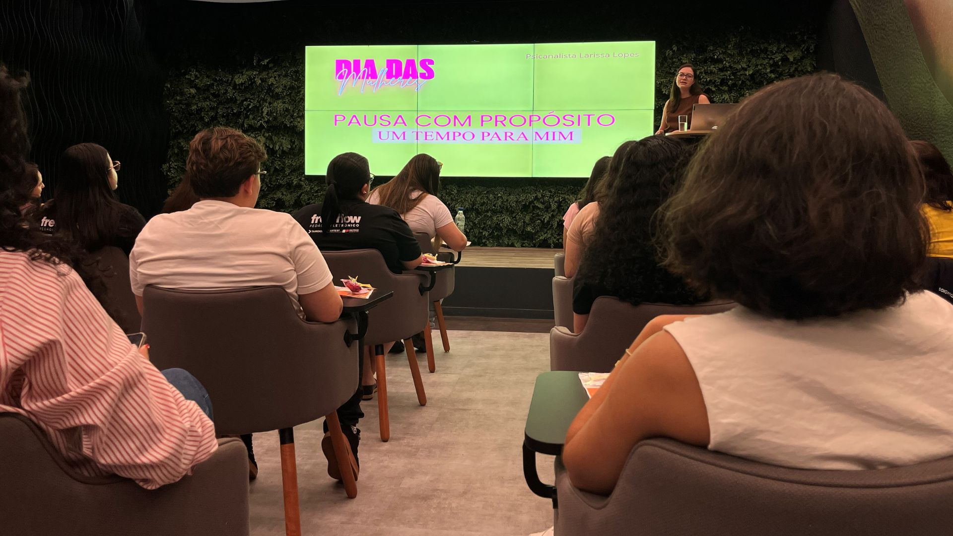 No primeiro dia, foi realizada uma palestra com a psicanalista e terapeuta sistêmica Larissa Lopes, que trouxe o contexto histórico e social do Dia da Mulher convidando-as a refletir sobre a importância de olhar para si com mais gentileza.